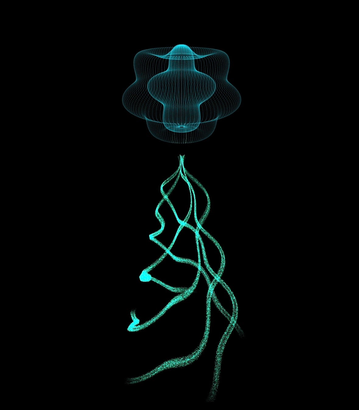 A generative world of floating jellyfish made of particles, coded in Three.js.