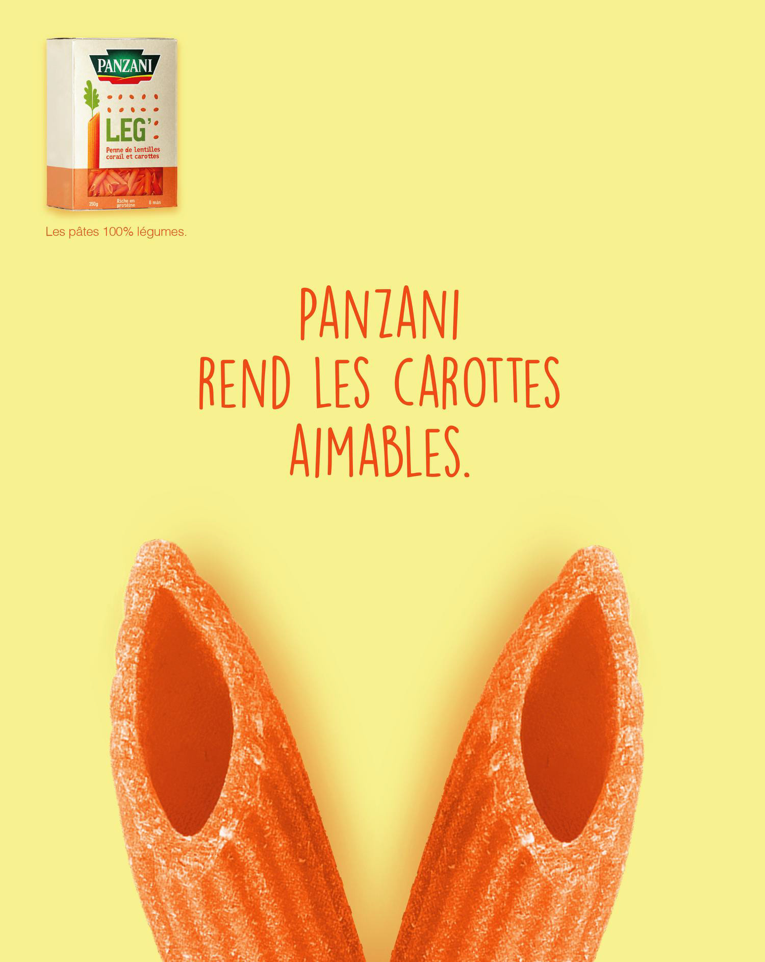 Pasta made entirely from vegetables, crafted to combine natural ingredients with a playful twist. The design transforms the pasta into a carrot and bunny ears, celebrating freshness, creativity and plant-based goodness.
