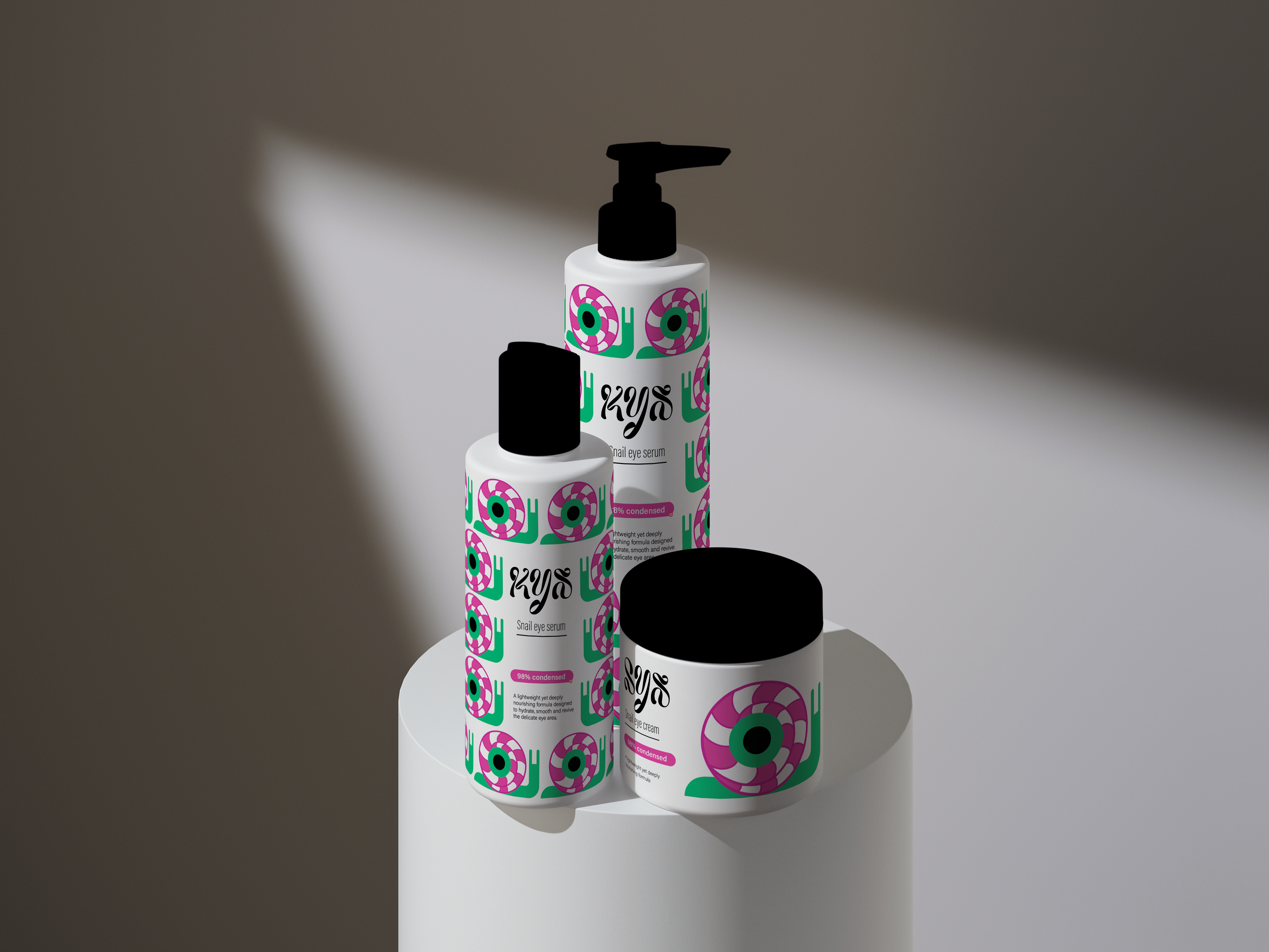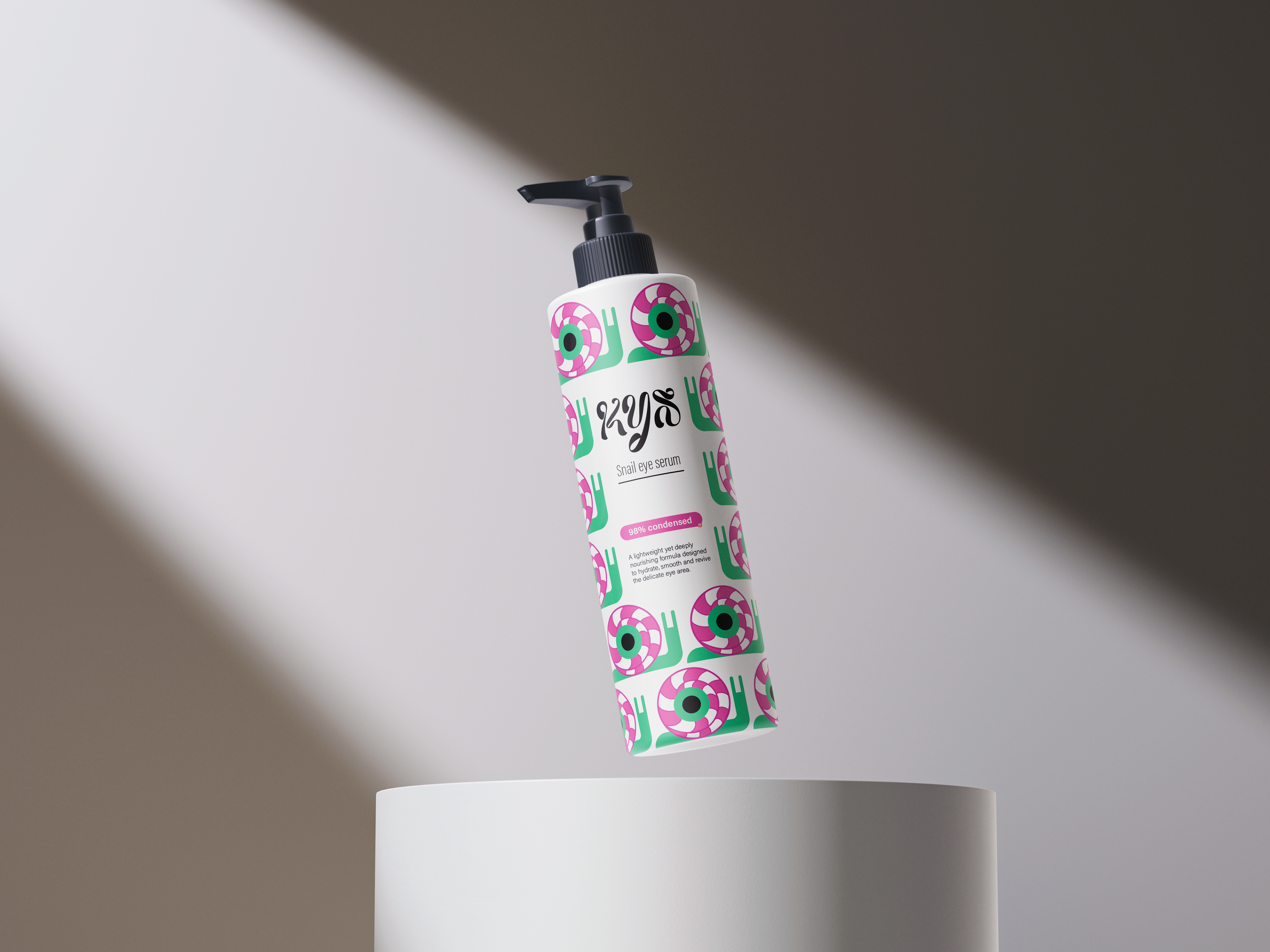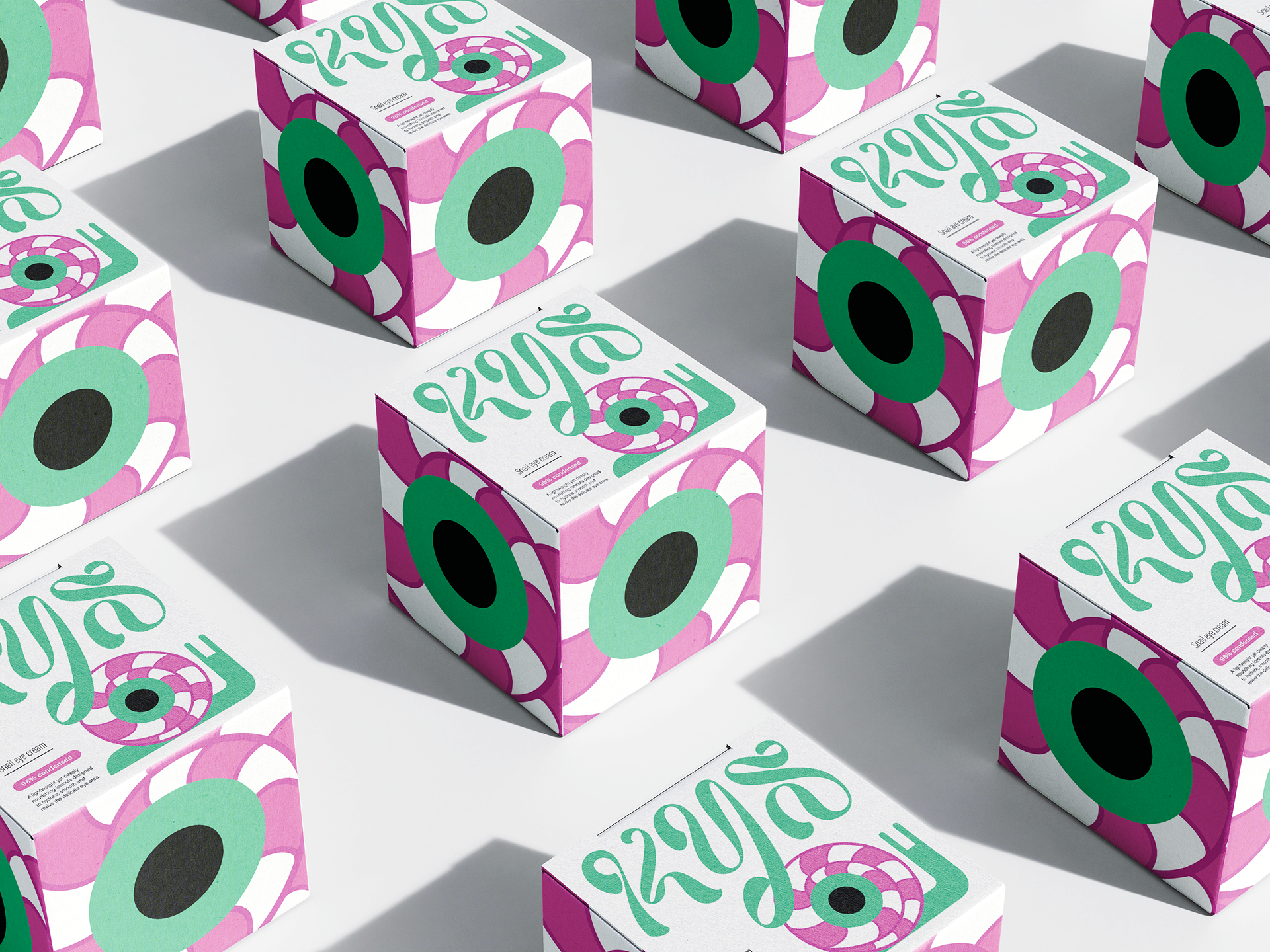 A nourishing formula enriched with snail extract to hydrate, smooth and brighten the eye area. Helps reduce the appearance of fine lines and dark circles for a fresh, revitalized look. The design features a bold, colorful pattern blending the eye and the snail, creating a playful and eye-catching identity.